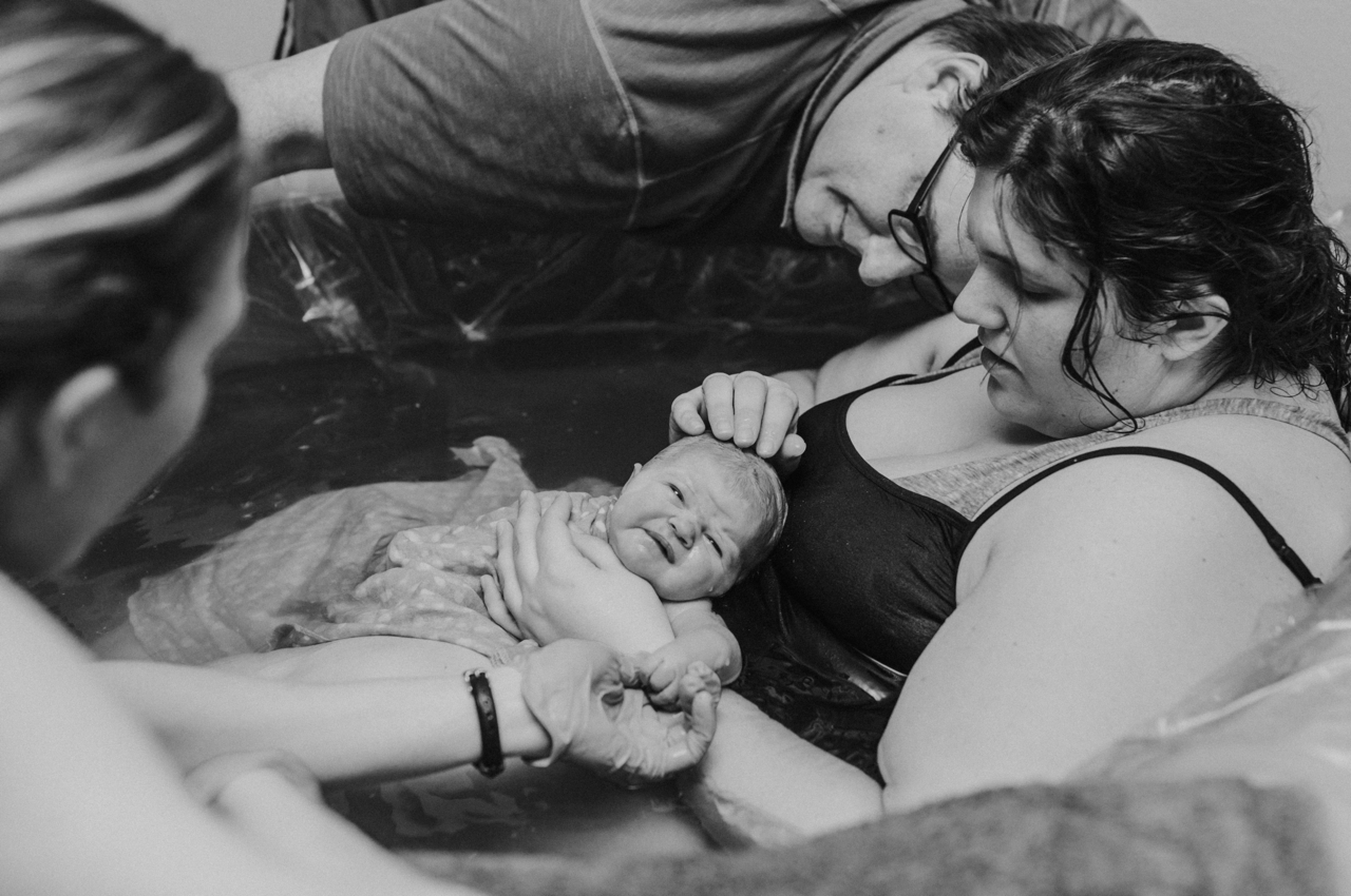 My incredible midwife had me in all kinds of positions getting the little miss to move her arm and hand. Once my water broke, contractions picked up with a whole new intensity. Rob was my rock, never leaving my side for even one contraction. The initial stage of pushing was intense to say the least, until baby finally moved her hand and entered the world right into her daddy’s hands! She had a super short cord that was wrapped around her neck, so they passed her through my legs and she came up for her first breath with the sweetest little pouty cry. There is no other feeling in this world like that very first glimpse of your freshly born baby.